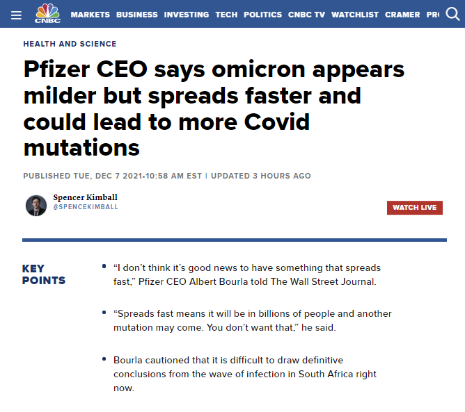Pfizer’s CEO, Albert Bourla, told the WSJ yesterday that Omicron does appear milder and this is another positive anecdote.