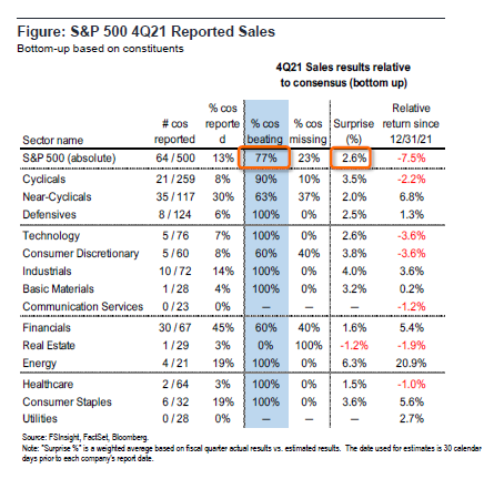 •  On the top line, overall results are beating estimates by a median of 4%. And 77% of those reporting are beating estimates.