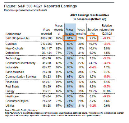 • Of the 408 companies that have reported so far (82% of the S&P 500), overall results are beating estimates by a median of 6%. And 81% of those reporting are beating estimates.