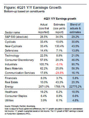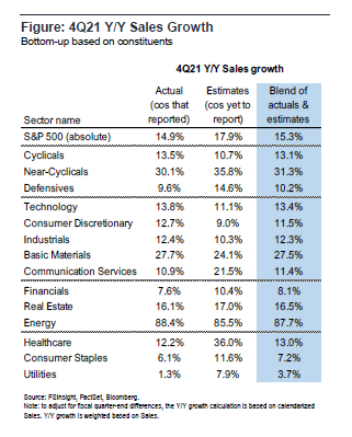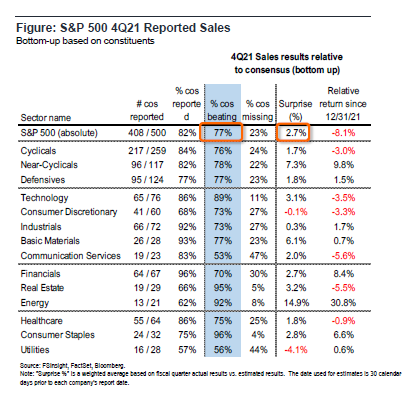 • On the top line, overall results are beating estimates by a median of 5%. And 77% of those reporting are beating estimates.