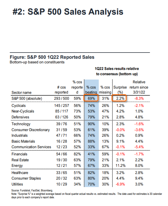 • On the top line, overall results are beating estimates by a median of 4%. And 69% of those reporting are beating estimates.