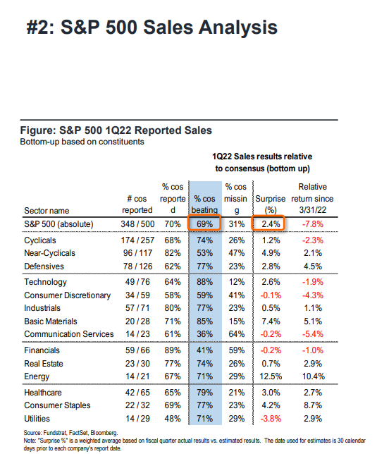 • On the top line, overall results are beating estimates by a median of 4%. And 69% of those reporting are beating estimates.
