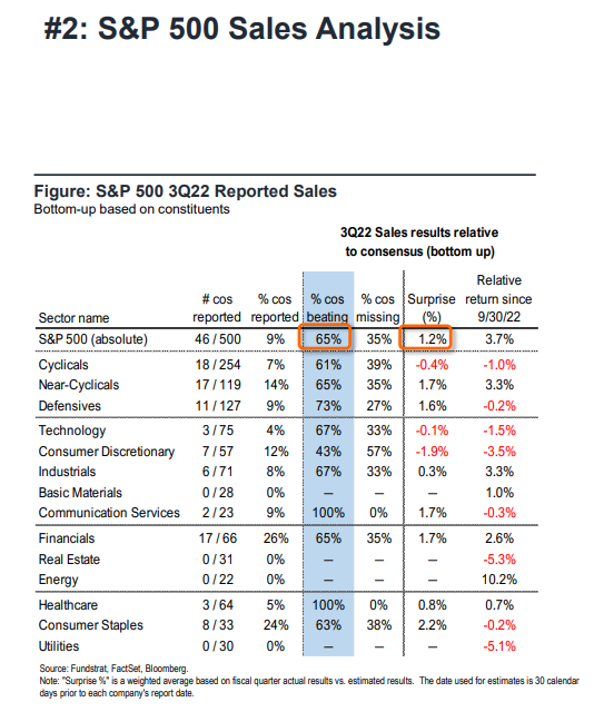 • On the top line, overall results are beating estimates by a median of 2%. And 65% of those reporting are beating estimates.