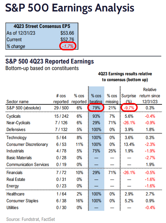 • Overall, 79% are beating estimates, and those that “beat” are beating by a median of 5%.