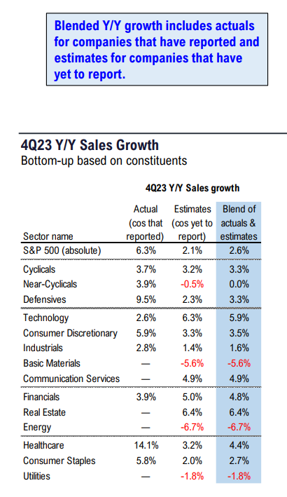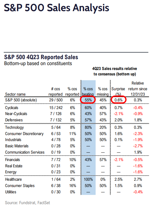 • On the top line, overall results are beating estimates by a median of 2% and missing by a median of -2%, and 55% of those reporting are beating estimates.