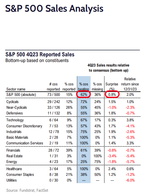 • On the top line, overall results are beating estimates by a median of 2% and missing by a median of -2%, and 62% of those reporting are beating estimates.
