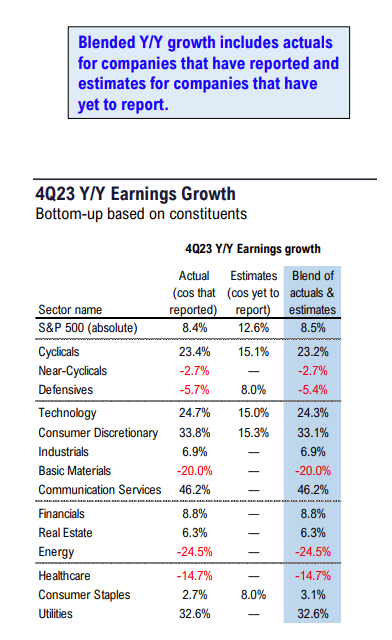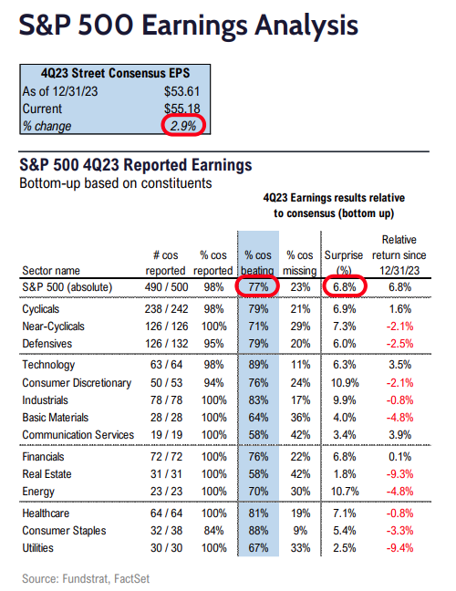 • Overall, 77% are beating estimates, and those that “beat” are beating by a median of 7%.