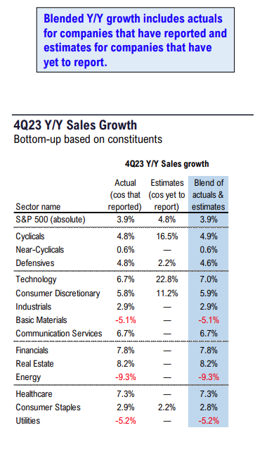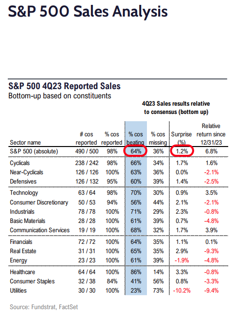 • On the top line, overall results are beating estimates by a median of 5% and missing by a median of -5%, and 64% of those reporting are beating estimates.