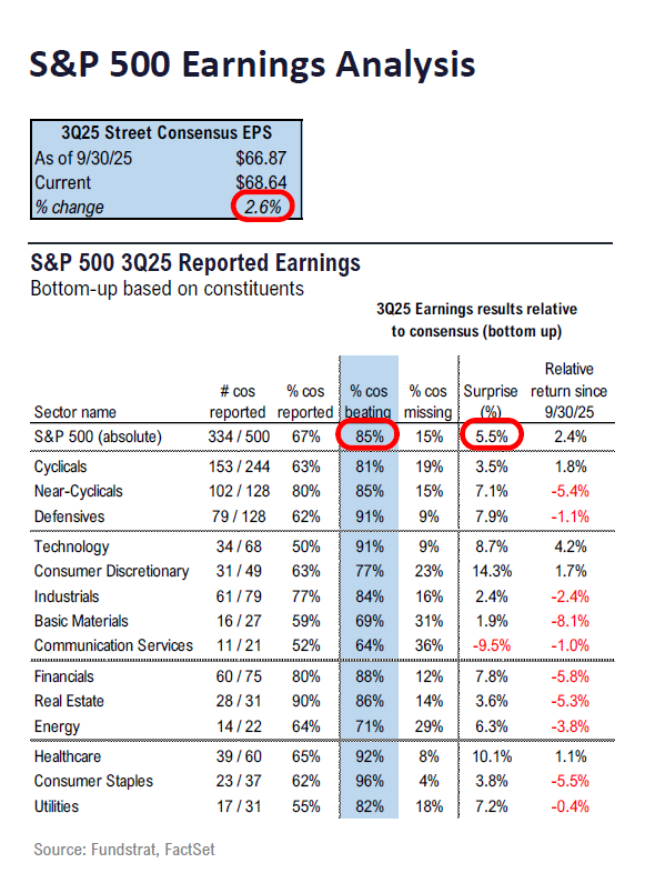 • Overall, 85% are beating estimates, and those that “beat” are beating by a median of 5%.