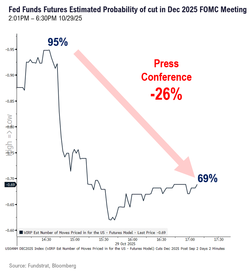 Market expectations for another rate cut this year fell from 95% to 69% after Powell remarked that “a further reduction of the policy rate at the December meeting is not a foregone conclusion.” The S&P 500 briefly dipped on the comment but recovered as Powell pointed to encouraging inflation developments, including limited price effects from new tariffs so far.