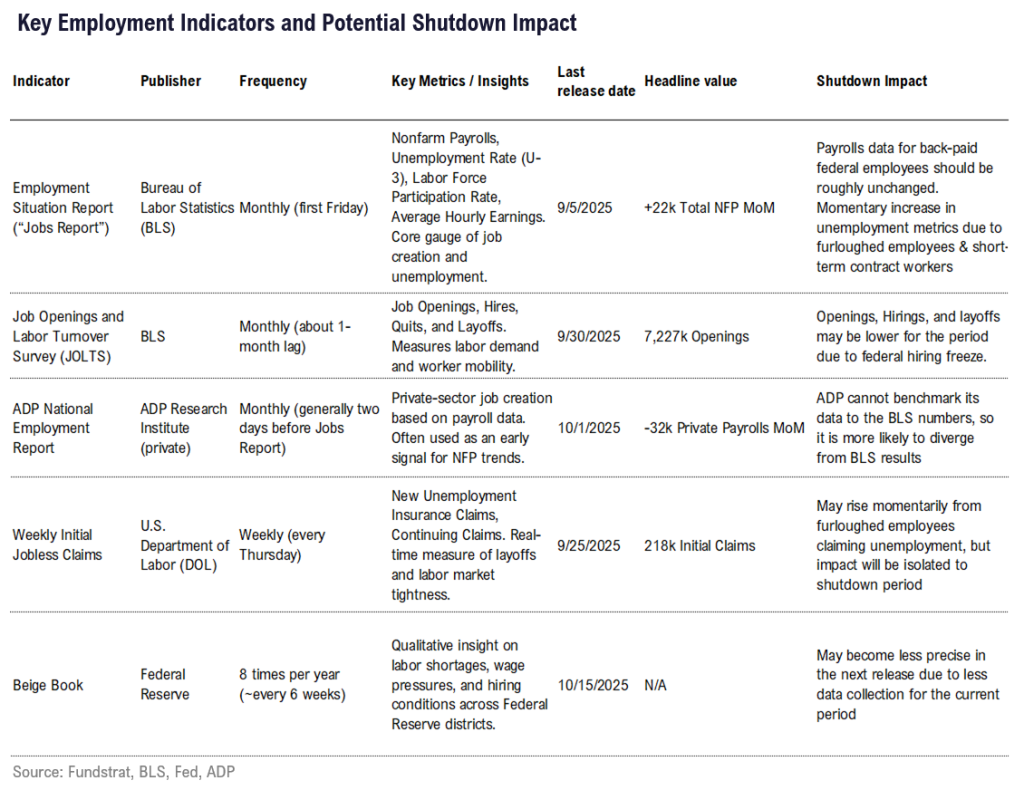 Below, we’ve compiled a table of some key labor market indicators, the latest release date and headline value, and possible impacts from the shutdown.