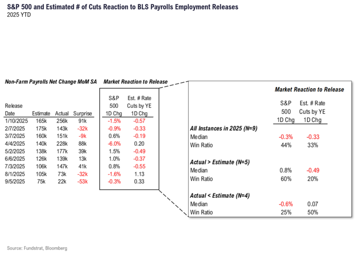 With the Government shutdown looming with no end in sight, the information and market reaction from some of the most important indicators remains in limbo. Historically the Jobs report has had a significant impact on both the S&P 500 and rate cut expectations, especially in 2025. Rate cut expectations generally increase when BLS Payrolls data is below expectations (soft), as the Fed is more likely to cut to support the labor market, and decreases when BLS Payrolls data is above expectations (hot), as the Fed would prioritize keeping inflation in check in a strong labor market.