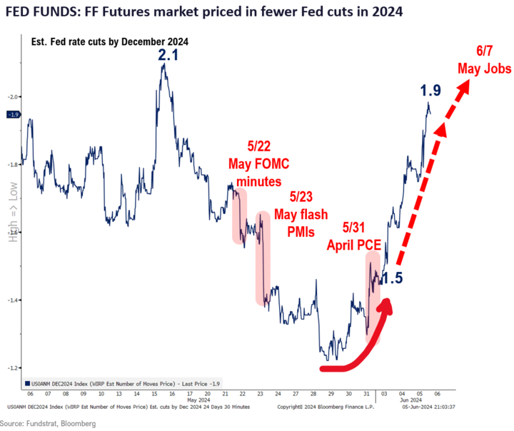 The macro data this week has been supportive of softening inflation, hence the rise in expected Fed cuts this year to 2.0, but the key is today’s jobs report. In the meantime, we see signs institutions adding risk as many missed the rise in May