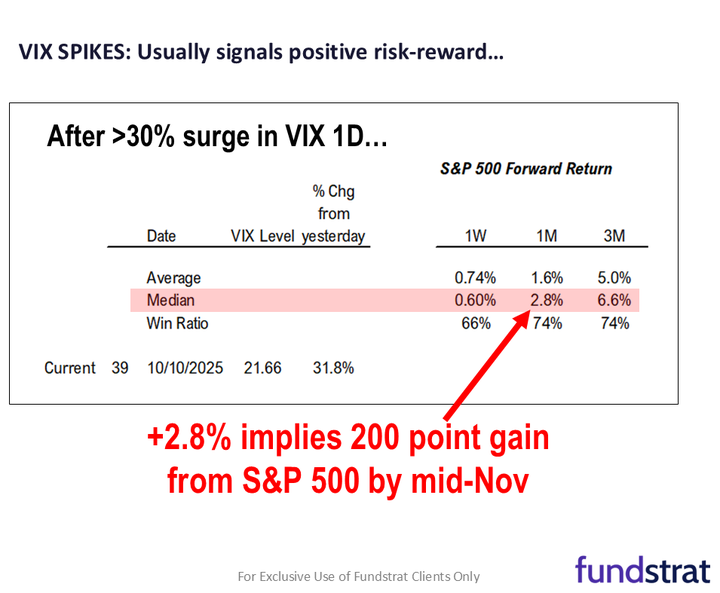 The 32% surge in VIX triggered substantial deleveraging, which since 1990 is often a sign of a local low. We expect stocks to rebound sharply and reach new highs by mid-Nov.