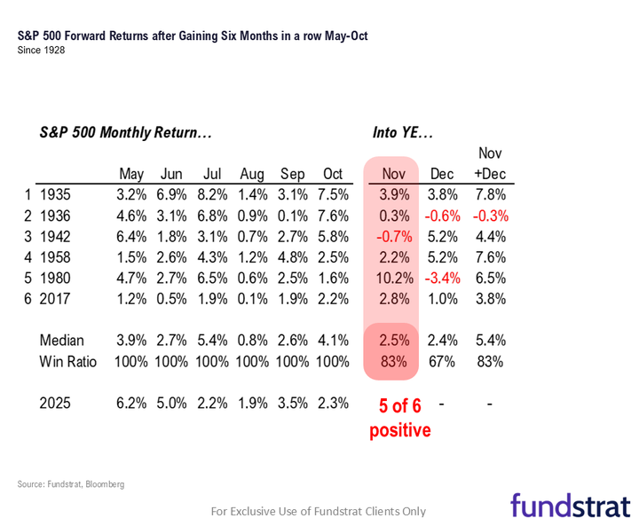 We believe November will be an up month for stocks. The past 100 years show, after being up six months in a row, November is likely to gain +2.5%, or +200 points.