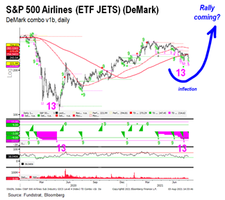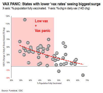 The stock price action has been harrowing in JBLU recently, but we also see signs of exhaustion in this trend at the industry level. Our Head of Research, Tom Lee, observed a rare DeMark ‘13 buy set up in the JETS 2.42% ETF last seen in May 2020 before a significant run-up in share prices. Our careful analysis of COVID-19 suggests that markets bottom in advance of the peak in cases. We are starting to see signs of reversal in some of the states most affected by the recent outbreak. We would also point out that the levels of previously infected plus the levels of fully vaccinated is very high in the United States and only increasing.