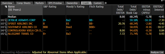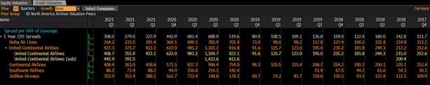 In terms of credit rating and default risk as expressed by CDS spreads, JetBlue is in the middle of the pack. We think this makes sense given their size and is mitigated by their clear plan to restore the balance sheet. We believe it is less likely given its business model and routes to go bankrupt than many airlines, but the risk is always a specter in this industry.