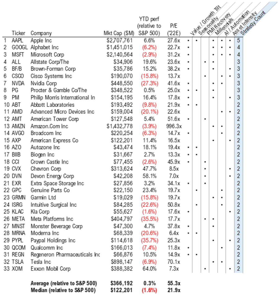 Below we’ve highlighted stocks that we recommend across at least two of our investment strategies for 2022. These companies could benefit from multiple themes and secular tailwinds – clear picks in our view.