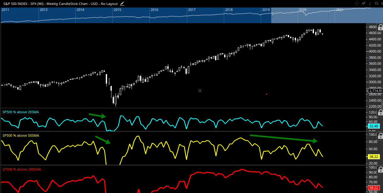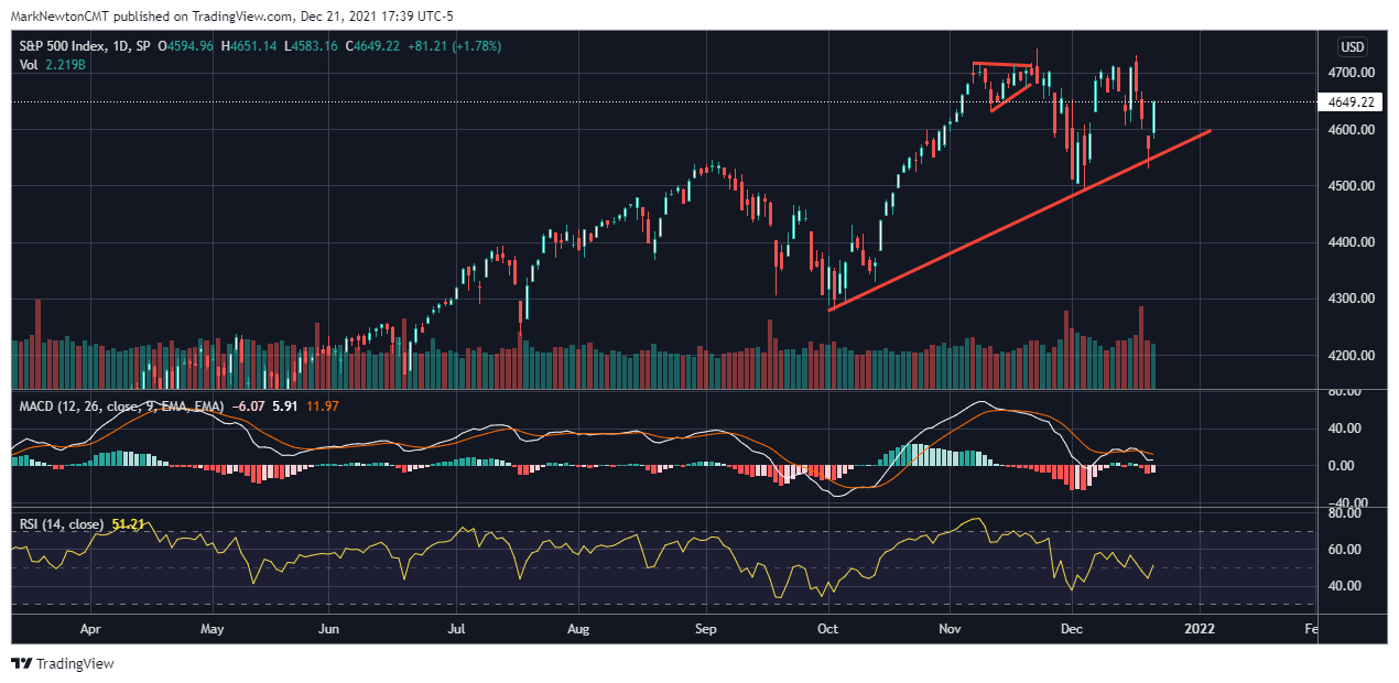 What’s interesting about the recent drawdown that has so many unsettled, is how little of this has affected SPX, or NDX thus far. As of Tuesday’s 12/21 close, S&P remains less than 2% off all-time highs made literally seven trading days ago. Yet, breadth statistics on the S&P alone suggest a much more severe pullback than what the major US benchmark indices are telegraphing. Only roughly 1/3 of all stocks (as of 12/20 close) are trading above their 20-day moving average(m.a.) while 38% are above their 50-day m.a. Finally, the percentage of SPX stocks above their 200-day m.a. is just 58% as of 12/20/21 close.