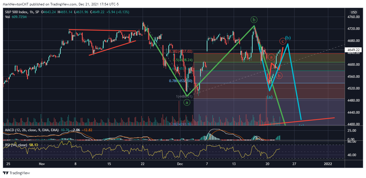 SPX hourly charts don’t yet show this to be the start of a push back to new highs- Simply stated, while price did make some meaningful progress in regaining about 50% of the recent drawdown on very positive breadth, prices still didn’t accomplish enough to think Santa had come early just yet. Mid-Cap and Small-cap indices have not broken out of near-term downtrends, and Elliott-wave structure (Shown below) still gives this a chance to weaken short-term before a move back to highs. Given that cyclically there looked to be a chance of bottoming on 12/22-23rd, one still can’t rule out a pullback into the days ahead which would then carve out a possible low. While those who aren’t as short-term focused might be better suited to just buy into this, and keep buying on pullbacks, most who care on direction will need to see a bit more progress before buying into this rally, and much of this has to do with technical structure. The rush to get onboard any December bounce at the first signs of liftoff, in thinking a Santa Claus rally is here despite poor ongoing momentum and breadth (i.e. Tuesday 12/21’s good numbers) and recent broad-based deterioration in groups like Transportation and Financials likely remains a bit premature.