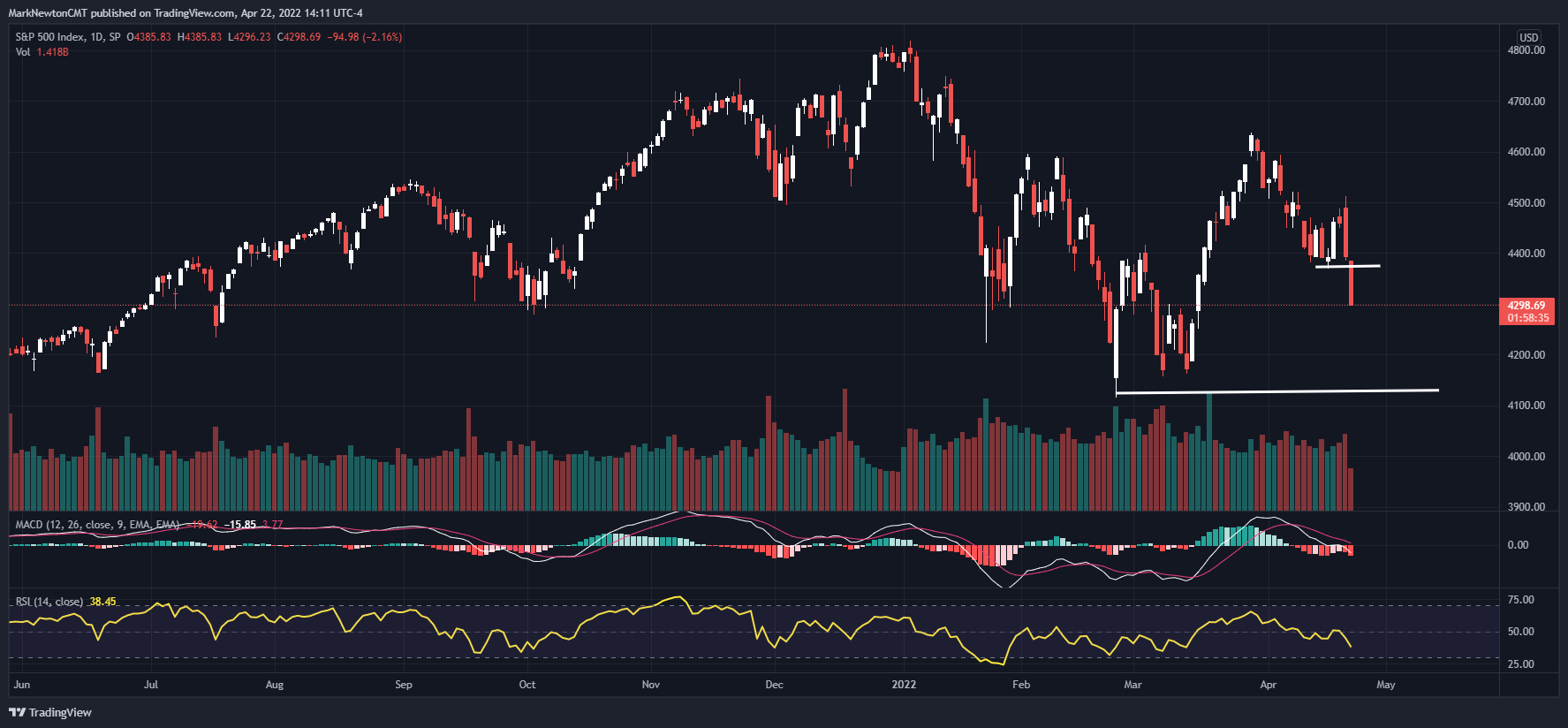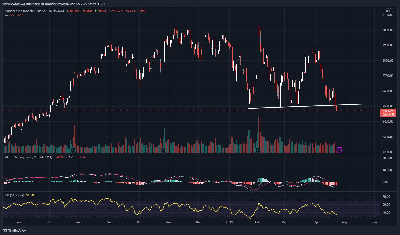 Don’t look now, but GOOGL and FB both have weakened down under March lows to close at new monthly lows to end the week. This is a structurally bearish development for both stocks, and given their huge weighting in the major indices, it likely will continue to have a negative influence on the major indices and on Technology as markets head into the month of May.