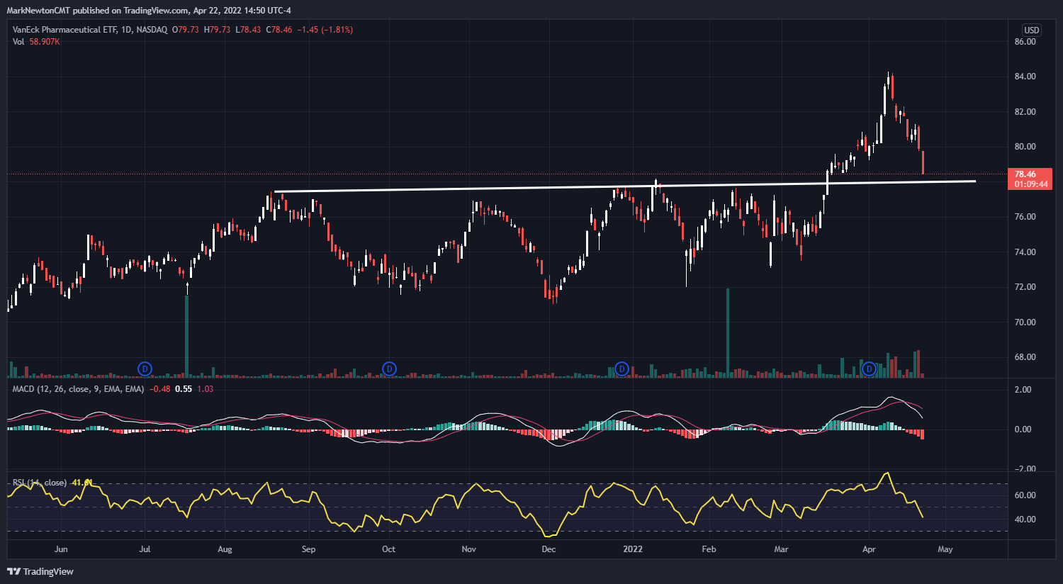 Overall, the Pharma space is an area I’m bullish on for 2022 and this remains a very positive technical sub-group within the broader Healthcare space. However, the last couple weeks have shown weakness in this group along with the broader market, and the VanEck Pharmaceutical ETF (PPH 0.88% ) has now round-tripped its breakout from mid-March and has pulled back to meaningful support near $77.50-$78.50 which is thought to be important.