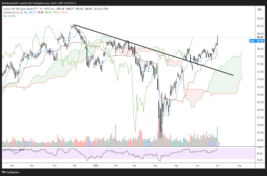 As seen below, Invesco’s Equal-weighted S&P 500 ETF (RSP 0.18% ) has broken out and begun to push sharply higher, which is encouraging to the rally in risk assets.