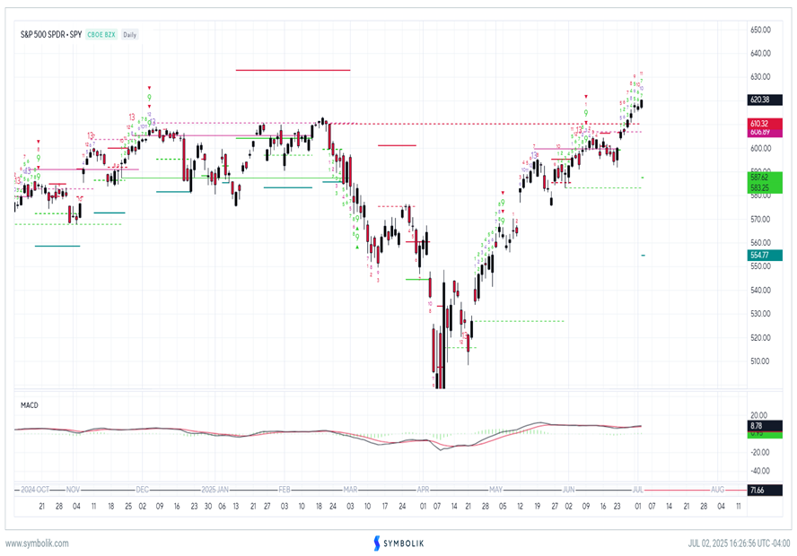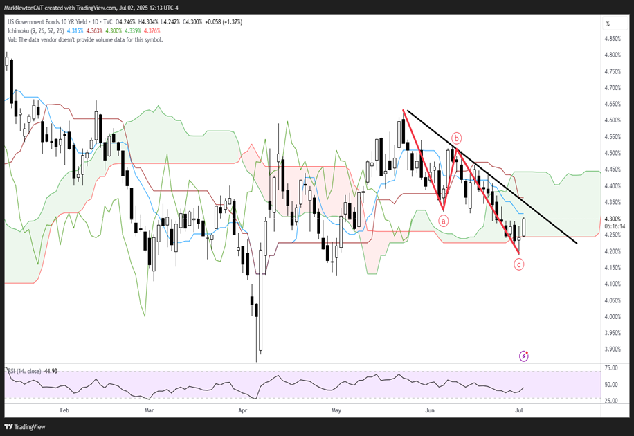 Short-term trends remain bullish while market breadth continues to expand, given the recent improvement in Equal-weighted S&P 500. It’s important that market participation is expanding after this push back to new all-time highs for SPX, and helps to establish some credibility to this move, which was lacking in both breadth and momentum back in May. Given the broadening out in the US Stock market over the last week, my view is that the push to new all-time highs will prove difficult to fade right away. Bond yields could very well diverge from the US Dollar’s weakness and bounce into mid-July as the Yield curve starts to re-steepen. Meanwhile, precious metals likely begin to turn back up in July, and Gold should push back to new all-time highs. Overall, I don’t sense that markets show much stalling out until after the Independence Day holiday, and even on a minor dip post 7/4, it’s likely that July should mirror the historically bullish seasonality trend in post-Election years that’s been working thus far in 2025. This calls for July strength in Equities, which might not show much consolidation until the month of August, which might prove more important.