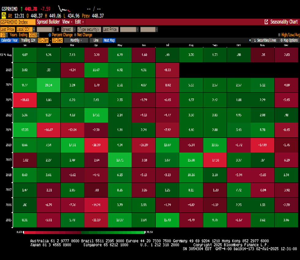 While my work shows this to be premature for Technology this July, it’s worth noting that Goldman Sachs’ US High Beta Momentum Index has been negative for the last five Julys and has been lower in seven of the last 10 years.