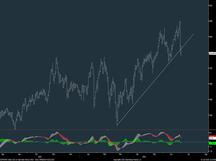 As shown below, the High Beta momentum index by Goldman Sachs (GSPRHIMO Index- Bloomberg) has pulled back to challenge its uptrend after a sharp rally from March lows.