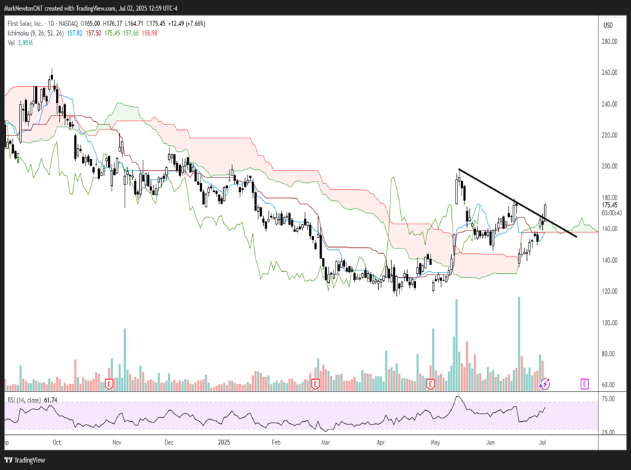 Today’s breakout of the minor 2-month consolidation is very bullish for this stock after the runup in May, and bodes well for continued gains. Technically speaking, I expect FSLR might advance to 212, then 234, and FSLR’s breakout has also coincided with a breakout in TAN 3.92% , the Invesco Solar ETF.