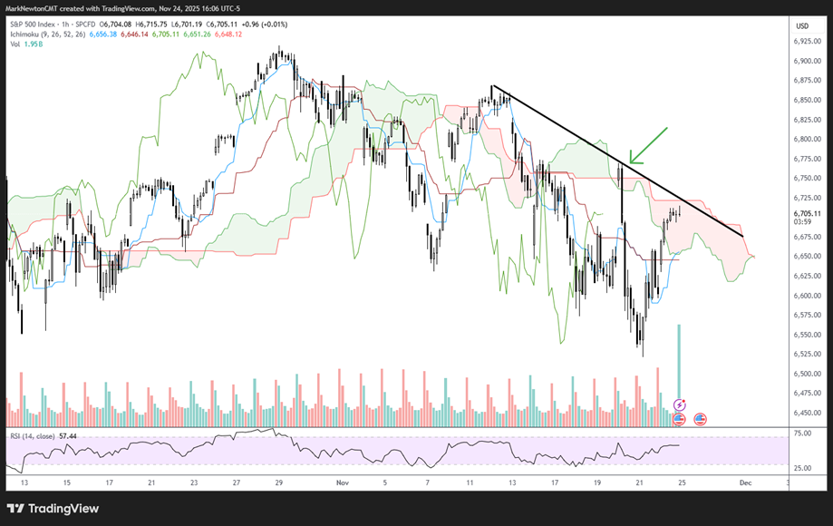 As discussed last week, Elliott-wave theory, Cycles, and DeMark all seem to converge on late November to provide support and a rally. Last Friday’s snap-back rally happened on above-average bullish market breadth, and now Monday’s rally also occurred on better market breadth after having started out the session on a weaker note.