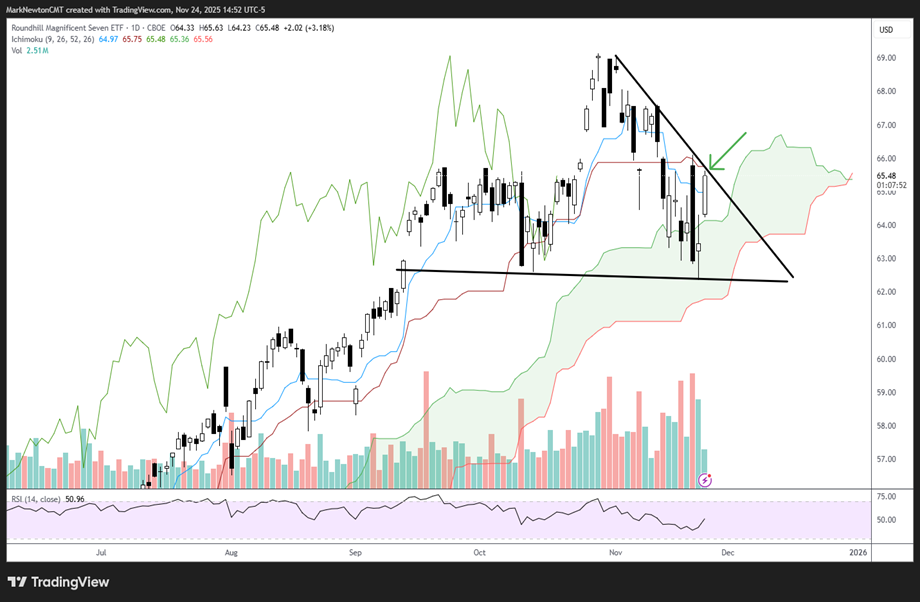 As seen below, the Magnificent 7 ETF by Roundhill (MAGS 3.21% ) did not break down under October lows, but rather held support and has bounced.