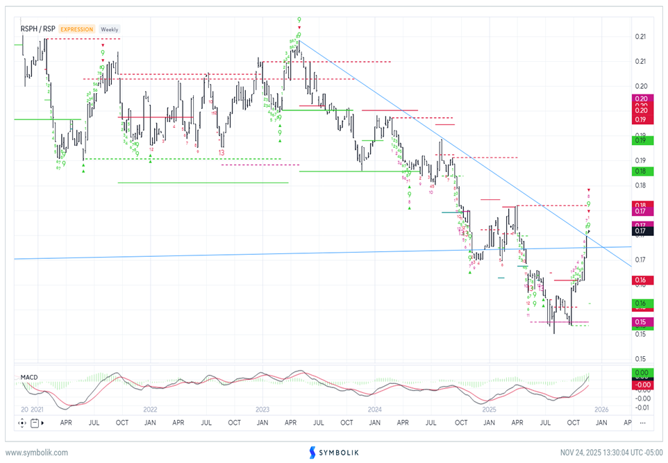As shown below, the weekly chart of RSPH 0.98% vs. RSP 0.41% looks to be at a critical juncture, and this relative ratio is showing a TD Sell Setup this week (9 Consecutive weekly closes above the close from four weeks prior), which often can drive some exhaustion in performance.