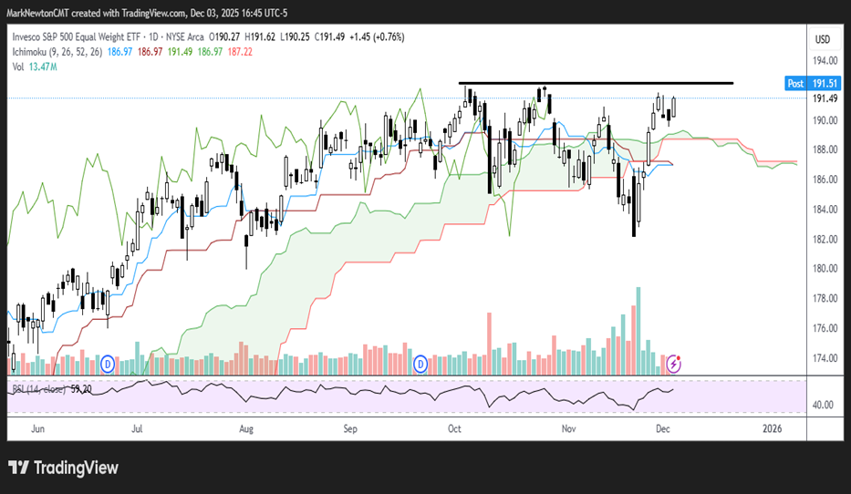However, with the chart below of RSP 0.76% , Invesco’s Equal-weighted S&P 500, the price now lies within 1 point of the fall highs of 192.33. This is thought to be an important level, and a breakout should arguably result in some strength in the broader market during the back half of December into January.