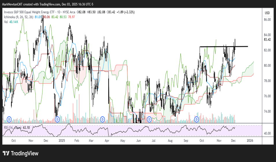 However, this move has not started yet, and it’s important to note that the breakout in the Equal-weighted Energy ETF RYE 2.32% , by Invesco, is seen as a short-term positive to this sector.