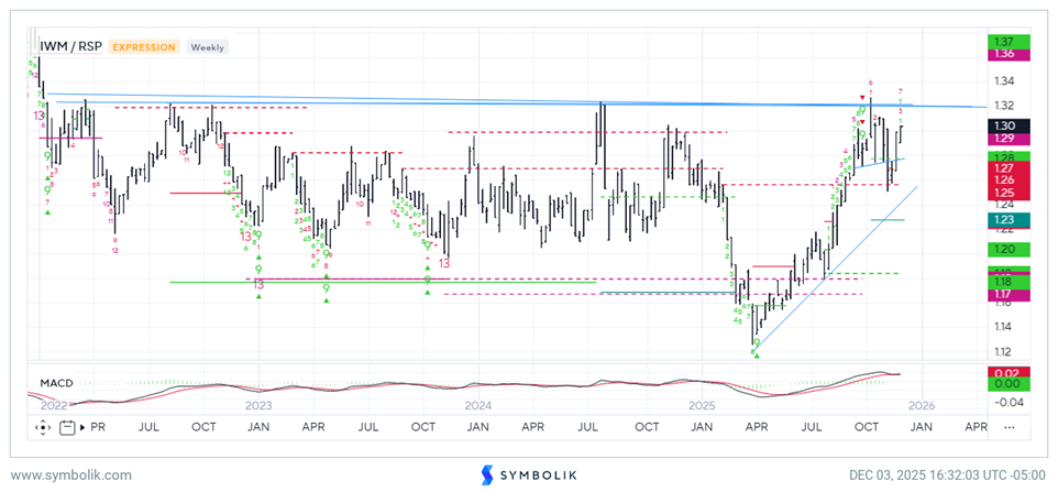 As seen below, the Small-cap rally from April into this Fall showed some minor consolidation after having tested key resistance vs. Equal-weighted ^SPX (Relative ratio chart shown of IWM 1.83% vs RSP 0.76% ).