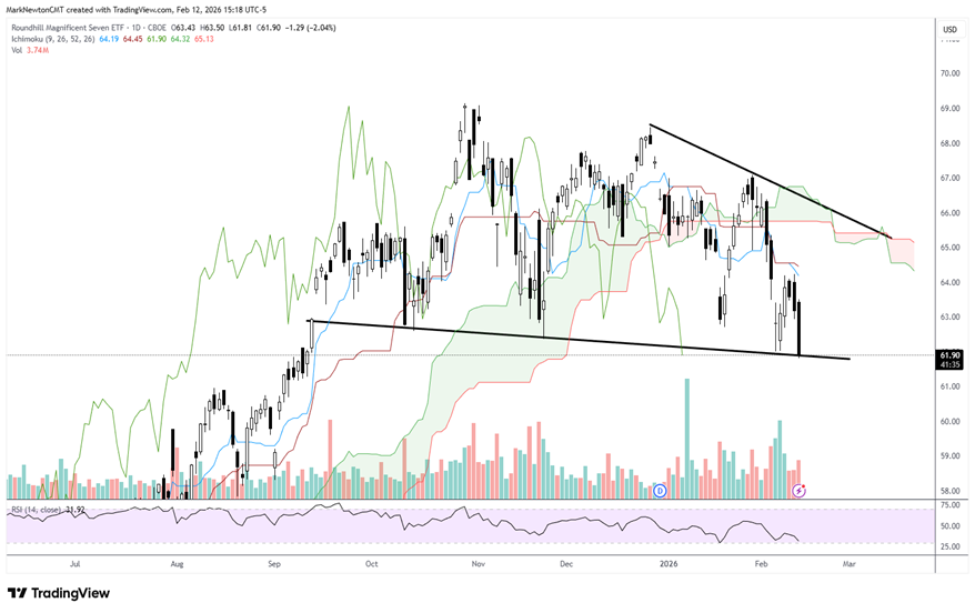 Recent weakness in AMZN and MSFT has resulted in the Roundhill Magnificent 7 ETF (MAGS) having pulled back to arguably a very important area, which needs to hold to prevent a further breakdown in Technology.