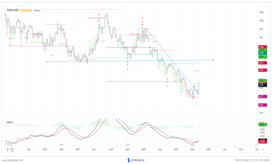 Thus, following 10 months of underperformance, this ratio now looks to be turning higher. Weekly ratio charts of RSPR vs. RSP have reached the highest levels of the year and have exceeded the downtrend from last April’s peaks.