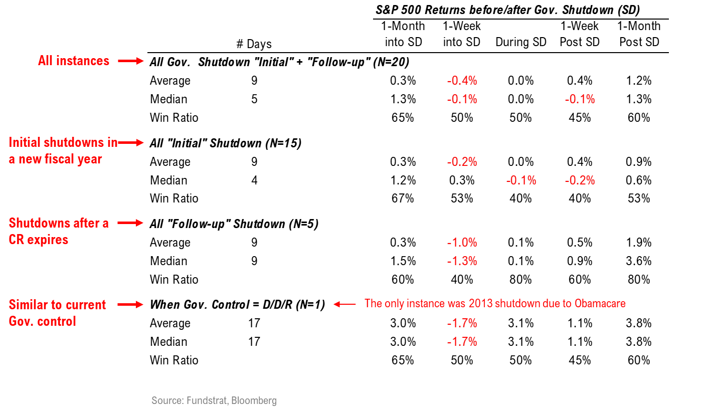 Fundstrat’s Data Science team led by Ken has done some research into market reaction to past government shutdowns, and it demonstrates that markets are not overly concerned by these blips in DC that are eventually resolved.